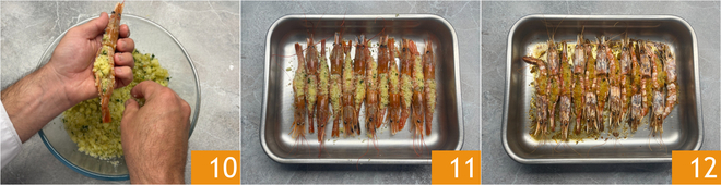 Recheie os camarões 10 e coloque-os em uma assadeira com a cobertura voltada para cima 11. Asse a 200°C por cerca de 15 minutos, até dourar completamente. Seus camarões gratinados estão prontos para serem saboreados 12.