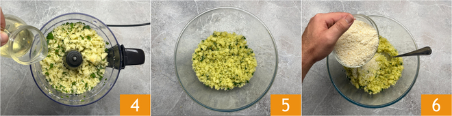 Adicione o óleo de amendoim 4 e bata novamente por 1 minuto. Transfira tudo para uma tigela 5, adicione o panko e misture bem 6. Reserve.
