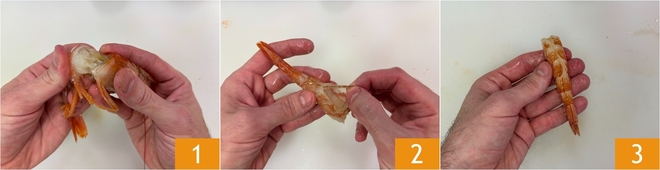 Para preparar os camarões à laranja, em primeiro lugar, dedique-se à Como limpar os camarões: separe o corpo da cabeça 1, elimine a carapaça e o fio interno 2 e deixe o rabo preso 3.