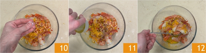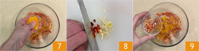 Extraia o suco espremendo a parte central da laranja na tigela com os camarões 7. Agora, pique finamente o alho e a pimenta sem sementes 8 e adicione aos camarões 9.