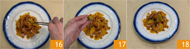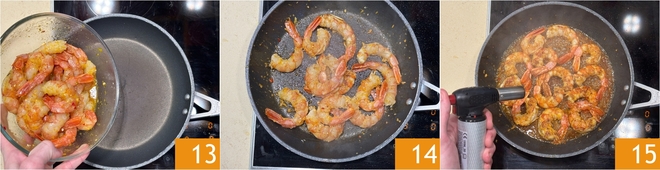 Neste ponto, aqueça bem uma frigideira antiaderente, depois adicione os camarões com a marinada 16 e doure-os por 2 minutos em fogo médio-alto 17. Despeje o Grand Marnier e flambe com um maçarico de cozinha para fazer evaporar a parte alcoólica, tendo cuidado para não se queimar 18. Continue cozinhando por mais alguns minutos e desligue o fogo.