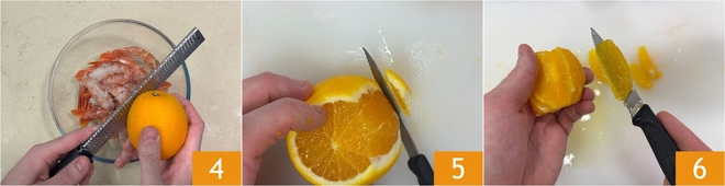 Transfira os camarões limpos para uma tigela e tempere com a casca de laranja 4. Com uma faca bem afiada, descasque a laranja, retirando completamente a casca 5, depois retire os gomos de laranja, tendo o cuidado de não pegar a parte branca 7. Reserve os gomos para a decoração final.
