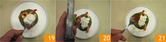 Tempere com uma colher de stracciatella 19, raspas de limão ralado 20, o suco de cítricos da marinada e o fundo de cozimento dos camarões 21.