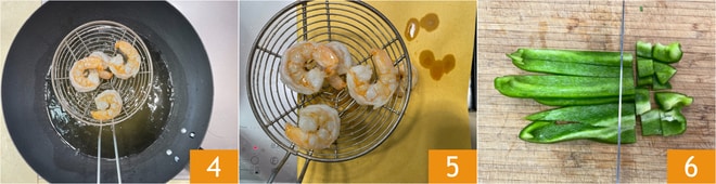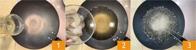 Para preparar os camarões ao molho picante, primeiro limpe os camarões retirando a cabeça, a casca e extraindo o intestino com um palito de dente. No wok, aqueça o óleo de sementes 1, quando estiver bem quente, adicione os camarões 2 e frite-os 3.
