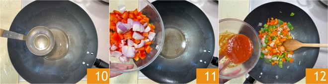 Aqueça mais um pouco de óleo no wok limpo 10, adicione os vegetais 11 e deixe cozinhar por alguns minutos. Adicione o purê de tomate 12.