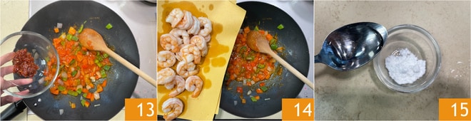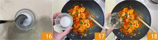 Tempere com o molho picante 13 e adicione também os camarões 14. Em uma tigelinha, coloque a fécula e 2 colheres de sopa de água 15.