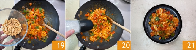 Por fim, adicione os amendoins 19 e ajuste o sal 20. Os camarões ao molho picante estão prontos para serem saboreados 21.