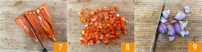 Faça o mesmo com os pimentões vermelhos 78 e as cebolas 9.