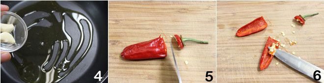 depois adicione dois dentes de alho e deixe dourar 4. Enquanto isso prepare a pimenta: lave-a, remova o pedúnculo 5 e corte-a ao meio para eliminar todas as sementes 6,