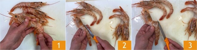 Para preparar os camarões crocantes, a primeira coisa a fazer é a Como limpar os camarões: remova as pernas e o carapaça, cuidando para deixar a cabeça e a cauda presas 1, depois corte o dorso com a lâmina de uma faca 2 e extraia o fio preto do intestino 3. Proceda desta maneira para limpar todos os camarões, depois passe para a cobertura.