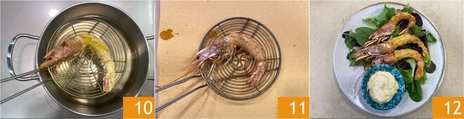 Aqueça o óleo de sementes até uma temperatura de 180°, depois mergulhe um camarão de cada vez com a ajuda de uma escumadeira 10. Quando estiver bem dourado (levará menos de um minuto), escorra e transfira para papel toalha 11. Sirva seus camarões crocantes com uma pitada de sal, acompanhados de maionese e folhas verdes 12!