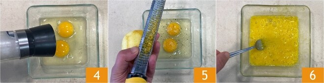 Despeje os ovos em uma tigela junto com o sal 4 e as raspas de limão 5, depois bata a mistura com um garfo 6.