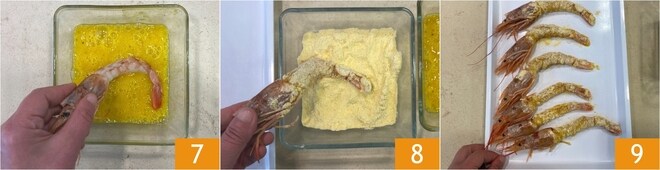 Mergulhe a polpa dos camarões na mistura de ovos 7, depois cubra com a farinha de milho que você colocou em outro recipiente, cuidando para que ela adira bem 8. Coloque aos poucos em uma bandeja os camarões empanados 9.