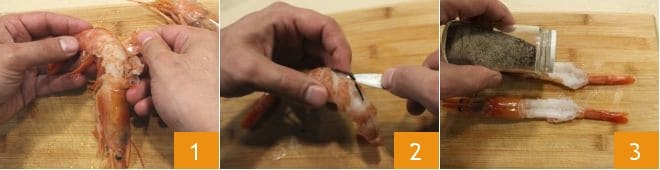 Para preparar os camarões em massa kataifi com molho de geleia de damasco, comece pela limpeza dos camarões: você deve deixar a cabeça e a cauda inteiras, então retire delicadamente o exoesqueleto dos camarões 1, depois faça um corte nas costas com uma faquinha e retire o intestino 2. Salgue e apimente os camarões 3, e polvilhe com folhas de tomilho.