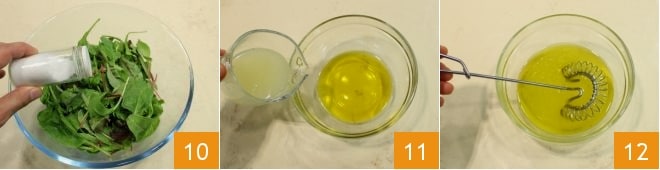 Depois salgue 10 e apimente a salada a gosto, então prepare uma citronete: despeje o azeite de oliva em uma tigelinha, adicione o suco de meio limão espremido 11, folhas de hortelã picadas e emulsione tudo 12, então tempere a salada mista.