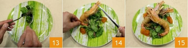 Distribua-a nos pratos de servir 13, tempere também com a geleia de damasco em volta da salada e coloque três camarões por porção 14: seus camarões em massa kataifi com molho de geleia de damasco estão prontos para serem saboreados 15!