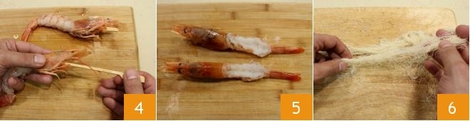 Em seguida, espete-os com um palito (4-5): dessa forma, você conseguirá envolver os camarões mais facilmente com a massa kataifi e eles manterão a forma durante o cozimento. Agora, pegue a massa kataifi (encontrada congelada em supermercados, deve ser descongelada na geladeira antes de usar); desfie-a com as mãos 6 para abrir os fios.