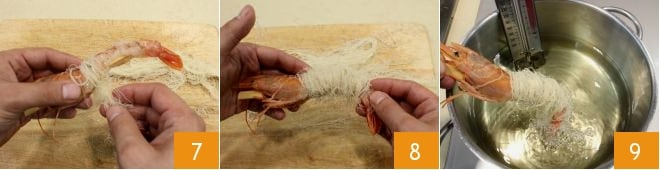 Depois envolva cada camarão começando pela cabeça, até a cauda para cobrir toda a parte central (7-8). Frite poucos camarões de cada vez em óleo vegetal quente, por cerca de 3 minutos (a temperatura não deve ultrapassar 170-180°C) 9; quando estiverem bem dourados, escorra-os com uma escumadeira.