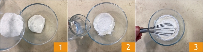 Para preparar os camarões em tempura, primeiro prepare a massa: em uma tigela, junte a farinha de arroz e a farinha de trigo 1, depois adicione a água com gás fria 2 e misture bem com um batedor para evitar a formação de grumos 3.