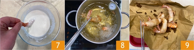 Passado o tempo de descanso, você está pronto para fritar: aqueça o óleo de sementes até 170°C-180°C e mergulhe cada camarão na massa segurando pelo rabo 7. Mergulhe os camarões no óleo em temperatura e frite-os por 1-2 minutos 7; a massa não deve dourar, mas permanecer clara. Escorra os camarões em papel absorvente ou para frituras para retirar o excesso de óleo 9.
