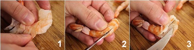 Para preparar os camarões gratinados, comece limpando os crustáceos: descasque-os 1, deixando o rabo e faça um corte com uma faca nas costas do camarão 2 para remover o fio preto interno 3.