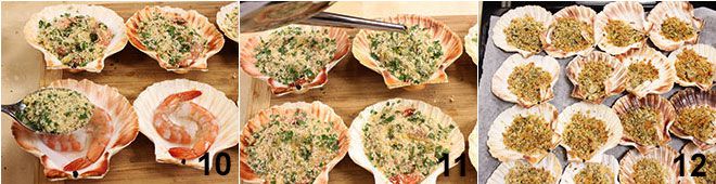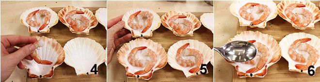 Coloque dois camarões em cada concha 4, de modo a ocupar o interior 5, e despeje uma colher de sopa de vinho branco em cada uma, diretamente sobre os camarões 6.