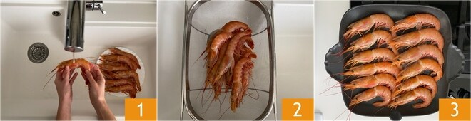Para preparar os camarões grelhados, primeiro, lave-os rapidamente em água corrente por alguns segundos, tomando cuidado para não quebrá-los 1, eles devem permanecer inteiros, então coloque-os em uma peneira e deixe escorrer 2. Aqueça uma grelha no fogo e, assim que estiver quente, coloque os camarões dentro 3.