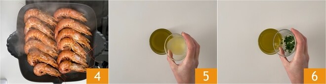 Deixe-os cozinhar em fogo alto por 3 minutos, depois vire-os 4 e continue cozinhando por mais 3 minutos. Enquanto isso, prepare o tempero. Em uma tigelinha, coloque o óleo, o suco de limão 5 e a salsinha picada 6.