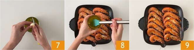 Adicione o alho cortado em pedacinhos 7 e misture. Quando terminar o cozimento, salgue os camarões. Use parte do tempero para pincelar os camarões 8, eles ficarão mais brilhantes e saborosos 9. Sirva os camarões grelhados com o tempero restante.