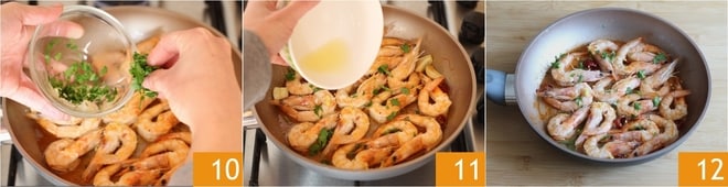 Tempere com uma pitada de sal, a salsinha picada 10 e o suco de limão 11, cozinhe por mais alguns minutos. Sirva os camarões na frigideira bem quentes 12.