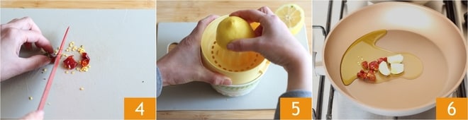 Corte a pimenta em rodelas 4, você pode decidir se quer manter ou não as sementes. Esprema o suco de um limão 5. Agora, aqueça o óleo na frigideira, depois refogue o alho descascado e a pimenta 6.