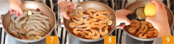 Após alguns instantes, adicione os camarões na frigideira 7 e deixe cozinhar por 2 minutos de cada lado, em fogo alto. Regue com o conhaque 8, incline ligeiramente a frigideira e deixe que flambe até que a chama se apague sozinha. Adicione a casca ralada do limão 9.