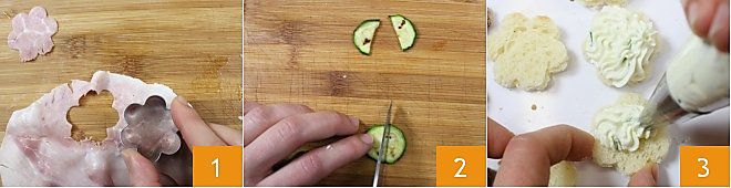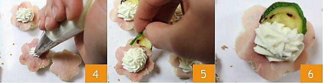 depois uma fatia de presunto, outro pouco de creme 4 e, por fim, decore com meia fatia de abobrinha 5. Os canapés de presunto cozido estão prontos! 6