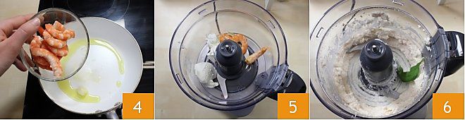 Cozinhe os camarões na frigideira por alguns minutos em fogo alto 4. Quando estiverem cozidos, bata os camarões com um processador junto com 50 g de Philadelphia 5, algumas folhas de manjericão, sal e pimenta a gosto, até obter um creme denso 6.