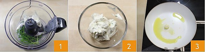 Para preparar o creme de ervas, coloque em um processador 60 g de Philadelphia com cebolinha 1 e bata tudo até obter um creme denso 2, então ajuste o sal e a pimenta, se necessário. Para preparar o creme de camarão, lave, limpe e descasque os camarões e doure um dente de alho com um pouco de óleo em uma frigideira antiaderente 3.