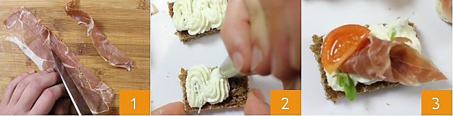 CANAPÉS DE PRESUNTO CRU: Para preparar os canapés de presunto cru, corte o presunto em tiras e enrole-as para formar pequenas flores 1, então corte em quartos dois tomatinhos. Pegue o pão de centeio, retire a crosta com uma faca e faça 5 retângulos de cerca de 5 cm de comprimento (para obter os retângulos, você também pode usar as sobras de pão da preparação anterior). Monte os canapés colocando um pouco de creme de ervas sobre cada fatia de pão 2. Complete colocando uma florzinha de presunto, um pedaço de tomate e uma folha de manjericão 3.