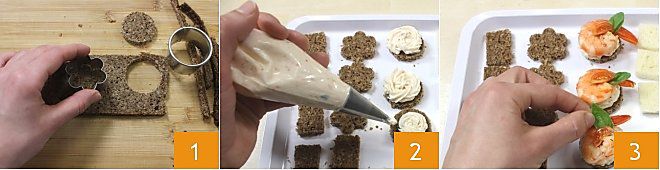 CANAPÉS DE CAMARÃO: Para preparar os canapés de camarão, comece preparando a base de pão de centeio: retire a crosta com uma faca e, com um cortador de 5 cm, faça 5 formas 1 (usamos um molde de flor, tipo canestrelli, e um círculo, mas você pode escolher a forma que preferir). Pegue 2 tomatinhos e corte-os em quartos, então coloque o creme de camarão em um saco de confeitar e decore as fatias de pão 2. Coloque um camarão com a cauda, que você já cozinhou na frigideira por alguns minutos com um pouco de azeite e um dente de alho, sobre cada aperitivo e complete a decoração com um quarto de tomatinho e uma folha de manjericão 3. Seus canapés de camarão estão prontos!