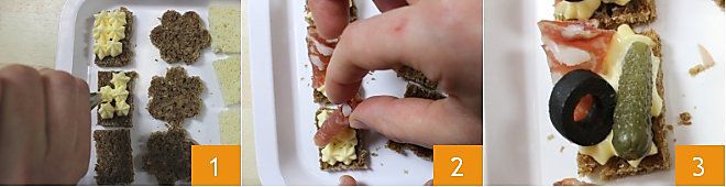 CANAPÉS DE SALAME: Para preparar os canapés de salame, corte as fatias de salame em quartos, faça 5 retângulos de pão de centeio como na preparação anterior, aproveitando também as sobras das preparações anteriores, corte uma azeitona em rodelas finas, então transfira a maionese para um saco de confeitar. Monte o canapé colocando maionese sobre cada fatia de pão 1 e um quarto de fatia de salame enrolada 2; decore, por fim, com um picles mini e uma fatia de azeitona 3. Seus canapés de salame estão prontos!