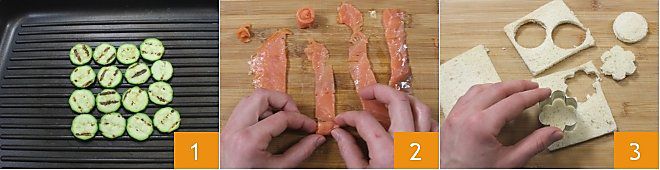 CANAPÉS DE SALMÃO: Para preparar os canapés de salmão, corte uma abobrinha em fatias finas e grelhe por alguns minutos (você deve obter 18 fatias) 1. Extraia a casca de um limão usando um descascador, depois corte-a finamente em julienne. Corte tiras de salmão com 1,5 cm de largura e 7-8 cm de comprimento, então enrole-as para formar uma roseta 2. Agora pegue o pão de forma branco, retire a crosta e, usando um cortador de 5 cm, faça 5 formas (usamos um molde de flor, tipo canestrelli, e um círculo, mas você pode escolher a forma que preferir) 3.