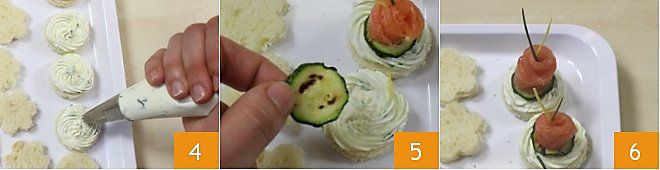 Agora você pode montar seus canapés: transfira o creme de cebolinha para um saco de confeitar com bico estrela e aplique um pouco sobre cada fatia de pão 4, coloque uma fatia de abobrinha grelhada (você usará 5 no total, as que sobrarem, reserve) 5 e, por fim, a roseta de salmão. Decore com um fio de cebolinha e a casca de limão 6. Seus canapés de salmão estão prontos!