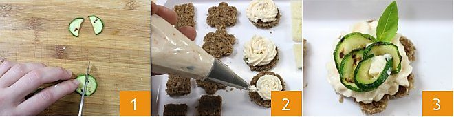 CANAPÉS DE ABOBRINHA E CREME DE CAMARÃO: Para preparar os canapés de abobrinha e creme de camarão, corte ao meio as 10 rodelas de abobrinha grelhadas que sobraram 1, decore os discos de pão de centeio com o creme de camarão 2 e decore-os com as abobrinhas para formar uma flor e uma folha de manjericão 3. Seus canapés de abobrinha e creme de camarão estão prontos