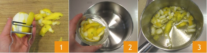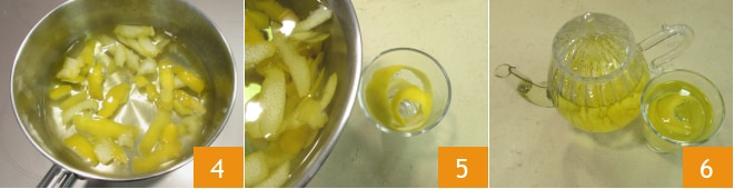Para preparar o canarino, primeiro lave bem o limão e retire a casca com um descascador, cuidando para evitar a parte branca, caso contrário a bebida ficará amarga 1. Coloque a água em uma panela, adicione a casca de limão 2 e leve para ferver, depois deixe ferver em fogo baixo por cerca de 10 minutos 3.