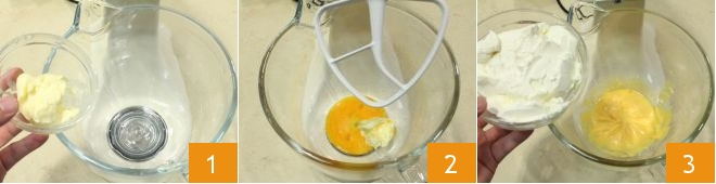 Para preparar os bolinhos doces de damasco, amacie a manteiga e coloque-a na tigela de uma batedeira equipada com a pá 1, adicione as gemas 2 e o sal e ligue a máquina até obter uma mistura clara, neste ponto adicione também o queijo fresco 3 e continue a bater a mistura,