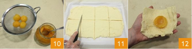 Escorra os damascos de sua calda 10. Se usar damascos secos, será necessário reidratá-los em água morna, depois esprema-os delicadamente e, se tiver caroço, retire-o. Se estiver na temporada, você pode usar damascos frescos, desde que pequenos. Quando a massa estiver fria e manuseável, divida-a cortando em 8 quadrados do mesmo tamanho 11, pegue cada porção e coloque metade de um damasco no centro 12