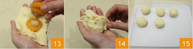 recheie o centro com meia colher de açúcar e feche com a outra metade do damasco 13. Envolva a massa ao redor do damasco 14 formando uma bolinha e sele bem o conteúdo, continue assim com o restante dos ingredientes até formar 8, que você colocará sobre uma folha de papel manteiga 15, cobrirá com filme plástico e colocará na geladeira por meia hora.