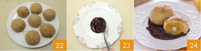 À medida que os prepara, coloque os bolinhos empanados em um prato de servir 22. Em um prato de sobremesa, distribua o molho de chocolate no fundo 23 e coloque por cima os bolinhos doces de damasco cozidos e temperados a gosto com manteiga derretida 24.