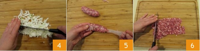 Limpe e pique a cebolinha 4, corte a linguiça, retire delicadamente a pele com as mãos 5 e, com uma faca, esfarele-a 6.