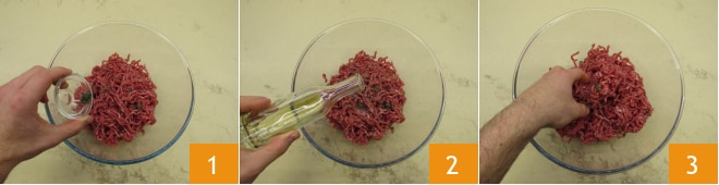 Para preparar os cannoli de carne cremosos, comece colocando a carne moída de boi em uma tigela. Tire as folhas de tomilho 1, ajuste o sal, a pimenta e acrescente um fio de azeite 2. Misture brevemente 3.