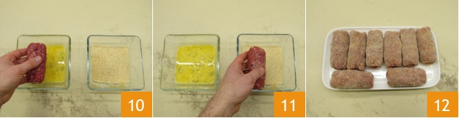 Passe-os primeiro nos ovos batidos 10 e depois na farinha de rosca 11 e, à medida que os prepara, coloque-os em um prato 12.