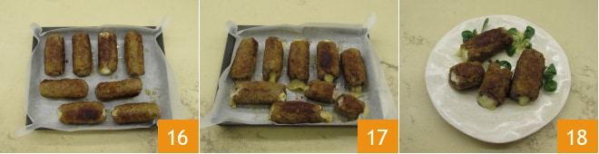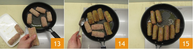 Aqueça a frigideira com um pouco de azeite e depois doure os cannoli de carne de todos os lados por alguns instantes 13. Vire-os com a ajuda de colheres 14, tendo cuidado para não desmanchá-los 15.